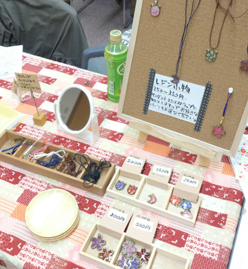 好きなレジン素材とストラップ又はペンダント紐を選んで、声を掛けてください。