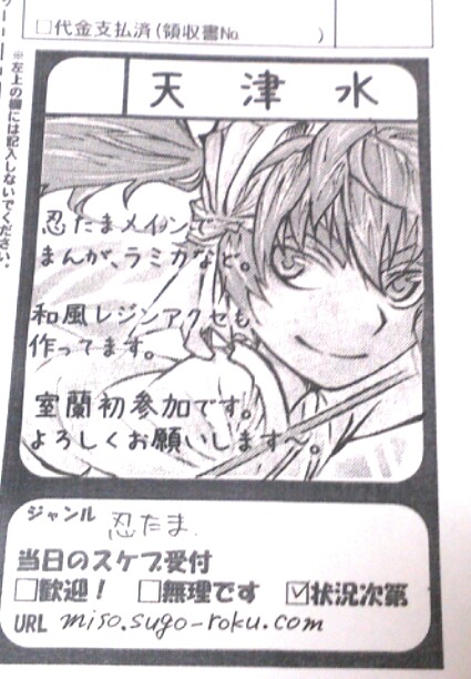 サークル名「天津水」スペース25・26で直参いたします。
